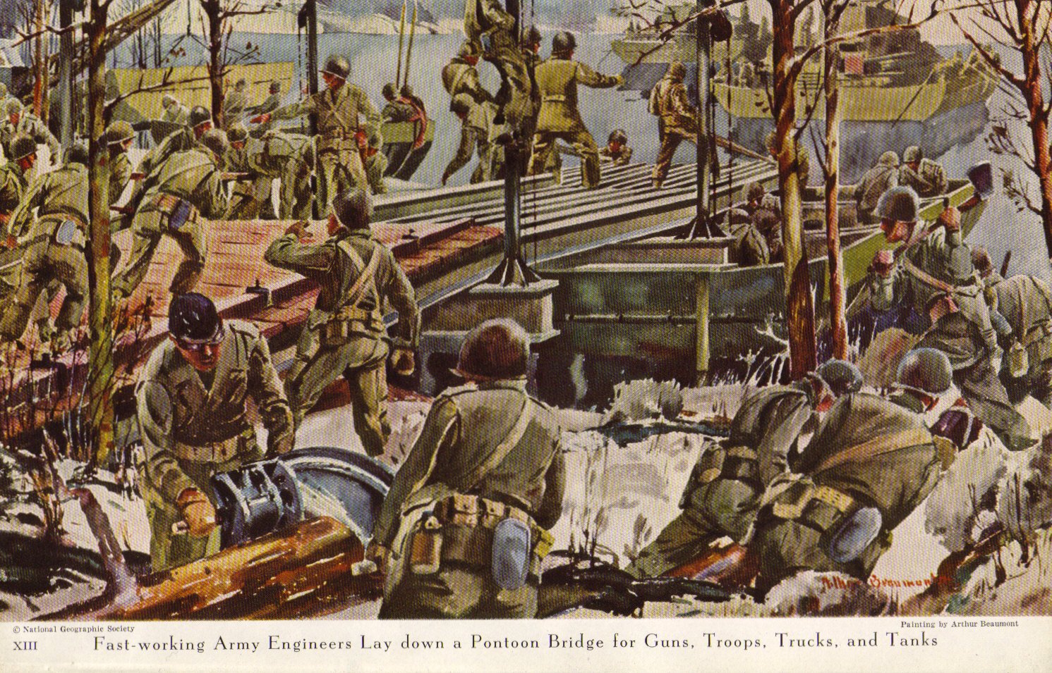 In case you can't read the caption at the bottom, it says: "Fast-working Army Engineers Lay down a Pontoon Bridge for Guns, Troops, Trucks, and Tanks." This is a lithograph featured in National Geographic. Not Shown: Incoming German Artillery, MG and small-arms fire that often accompanied tasks like this one!