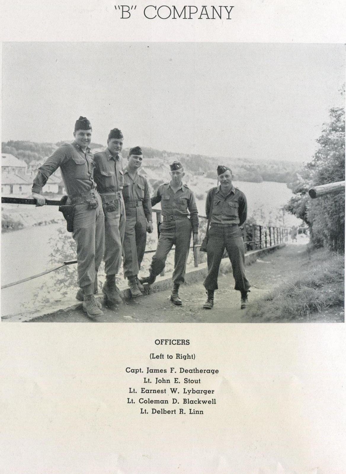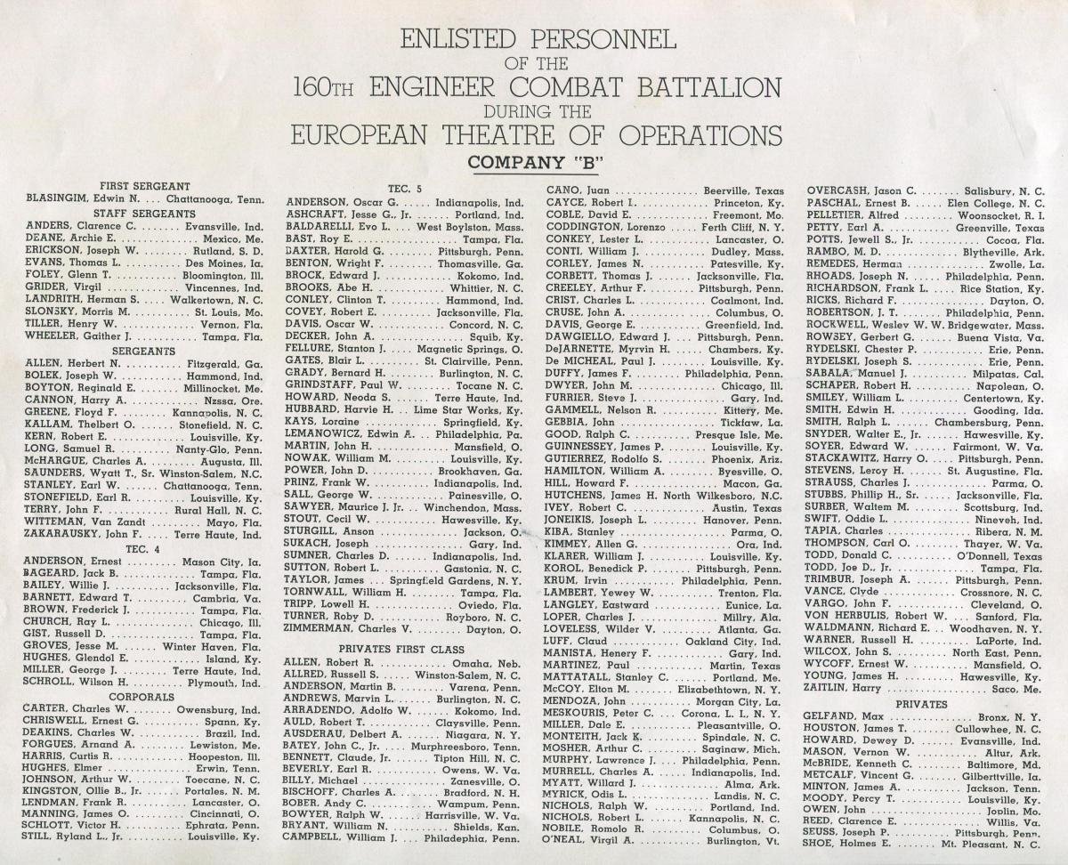 Wayne, I am posting a few pictures from my copy of the 160th Engineer Combat Battalion book. These pictures do not have a lot of detail. The best that I can tell, the group pictures were taken around March 1945. These group pictures of Company B would be men that Robert served with and that he probably was at least aquainted with most of them, some close friends. I will be posting more soon.