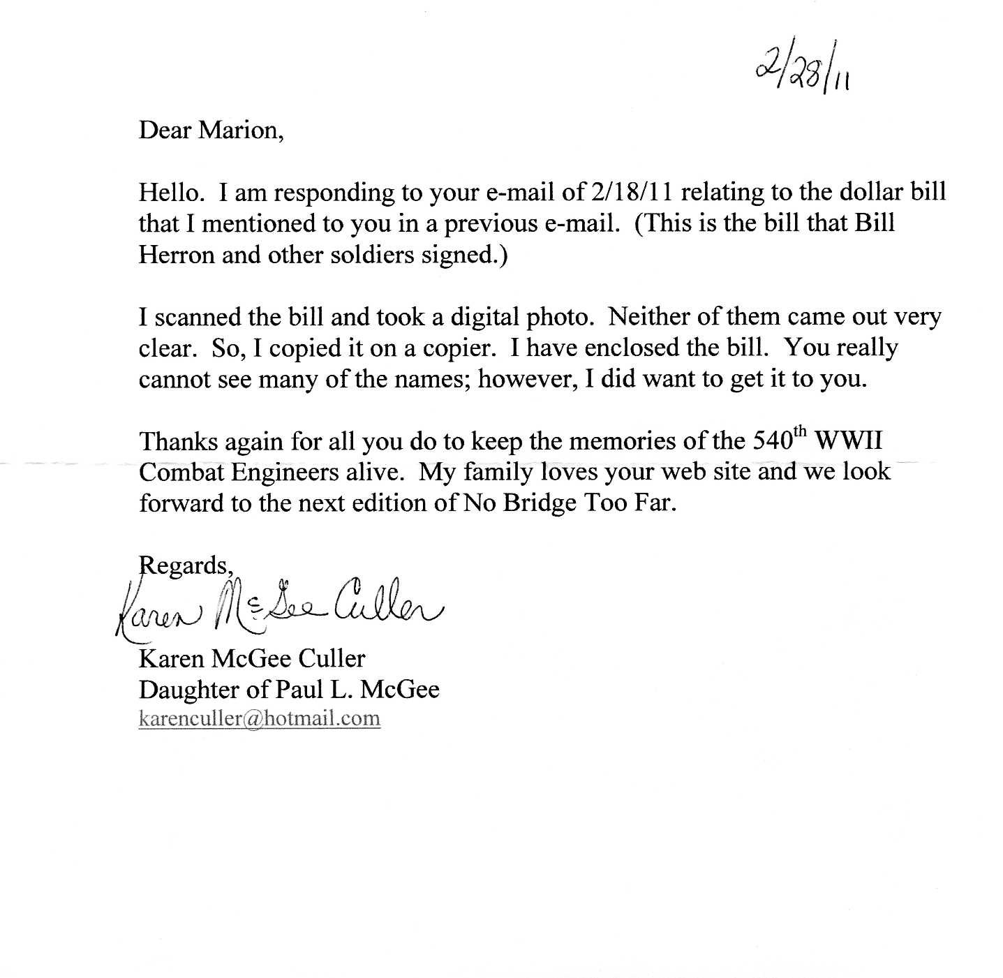 Last month was talking with Karen, the daughter of Paul McGee, 540th Combat Engineer. She mentioned something about a signed dollar bill from the war, which she still had in her possession.
