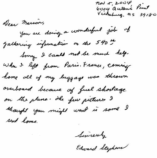 This morning I checked my mail and Ed was sweet enough to part with a large and wonderful photo of a 540th reunion from the 60’s. Ed also gave me four of the photos that he had sent home from France in December of 1944. I was so touched that he parted with these because I know how important they were and are to him. Rest assure that I wrote him a very nice letter this afternoon to thank him for sharing what little he had. Below is his letter to me and the four photos. I still have to scan the reunion photo and promise to share it with you soon.