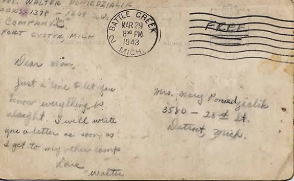 My father, Walter (Monday) Poniedzialek, was born on March 30, 1917 in Detroit, Michigan, and was a proud member of the 540th Combat Engineer Regiment. He started his army stint at Fort Custer near Battle Creek, Michigan. I gathered this information from a postcard dated March 1943, that was sent from the Fort (Camp) Custer to his mother Mary.