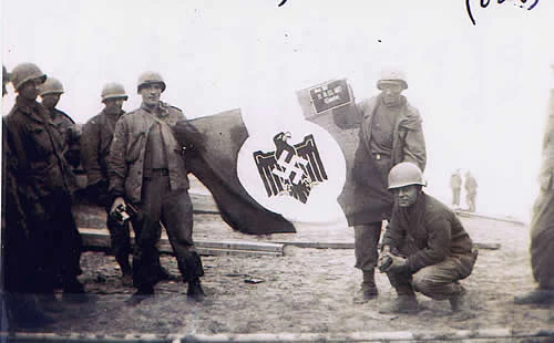 Photo taken at Worms on the bridge across the Rhine on 03-26-1945. This was in the 3rd Division sector. In the photo: Hoagland, Netson, McSparin, Capple, Vander Wall, Lee, Rinelli and Bell.