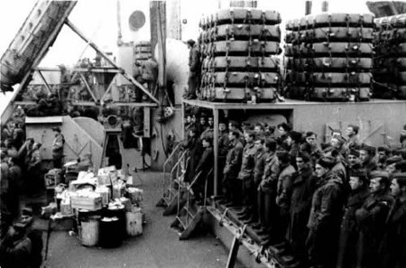 Still, all is not lost, I thought. Surely I would be home for what would have been another Christmas overseas. Christmas was only 25 days away. Wrong again! I spent Christmas and New Years Day in a “redeployment unit” (the 84th Inf. Div.) in Germany doing absolutely nothing but wait for transportation. While there, we were asked to go down to Heidelberg (in trucks) to attend General Patton’s funeral. We told them what they could do with General Patton’s funeral. In early January 1946, we were transported in 40 and 8’s to Le Havre, where we were billeted in a Nissan Hut city erected to hold German POWs awaiting shipment to the States. Stalag 17 revisited! Another wait began for a ship. On January 10, 1946, we were packed into the S.S. Maritime Victory, one of Henry Kaiser’s grubby little freighters, and we headed west into some of the worst winter storms ever experienced in the North Atlantic. I was continuously seasick for eleven days and I lost 15 pounds.