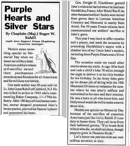 I was able to make contact with John Rahill’s family via the Internet during the past year. His nephew, Major Roger W. Rahill sent me the following article, which appeared in the 5/28/02 issue of “Herald Union”, which is printed by the “Stars & Stripes” in Germany. I will be 82 years old tomorrow. – Russ Cloer