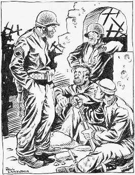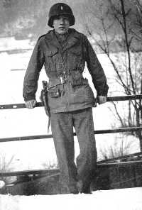 Rebovich and I wore the field uniform of wool O.D., combat boots, combat jacket with the well known 3rd Division patch and Combat Infantry Badge. Over the jacket, we wore our web belts with holstered .45 caliber pistols, trench knives, and ammo pouches and we still wore our camouflaged steel helmets. We hadn’t had a change of clothes in a month and those we wore had been slept in because it was so cold. We must have looked like Bill Mauldin’s Willie and Joe, except for our scratched and tarnished insignia, crossed rifles and silver bars.
