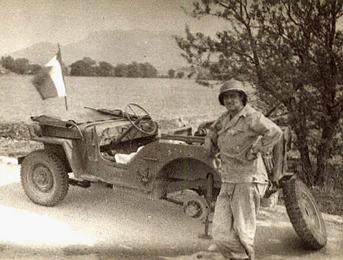 A photo of me in one of my recon jeeps, taken on the Anzio Beachhead in early 1944. The driver’s name was Leo Perrault.